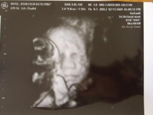 One of my baby girls. The other baby had her face down, so we couldn't get a good picture of her face. There is a foot right in front this baby's chin if you look carefully, and a butt in front of her right eye. They still have a lot of plumping up to do in the next 10-14 weeks, but I just thought she was already so pretty.